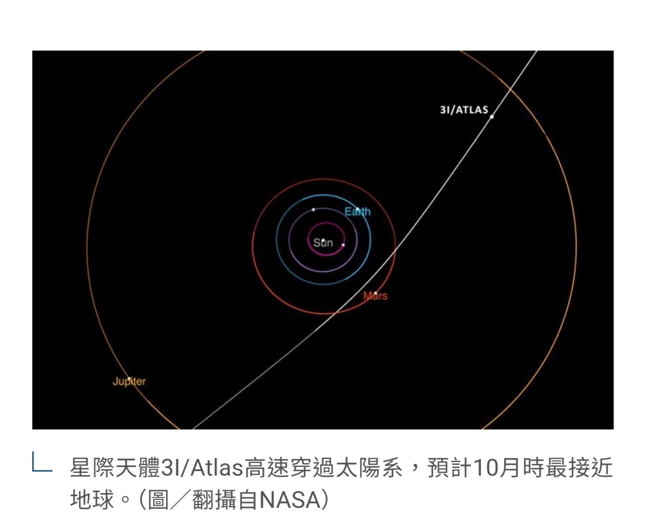 近期美國太空總署(NASA)公布,星際天體(Interstellar object)3I/Atlas高速進入太陽系,研究人員報告稱,其可能很巨大,直徑最大估達5.6公里,但也可能只有320公尺, 初步判斷3I/Atlas是彗星,但實際組成要等其更接近地球時才能判斷。有哈佛大學科學家指出,3I/Atlas有「一絲可能性」會是艘外星飛船,「它可以來拯救我們,也可以毀滅我們」引發各界討論。