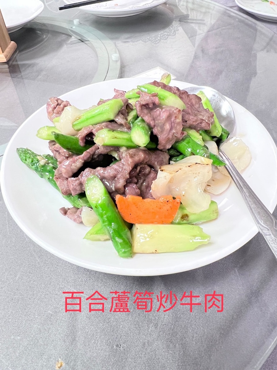 百合蘆筍炒牛肉-蘆筍跟百合都保持清脆,搭上一點芡與軟嫩的牛肉結合