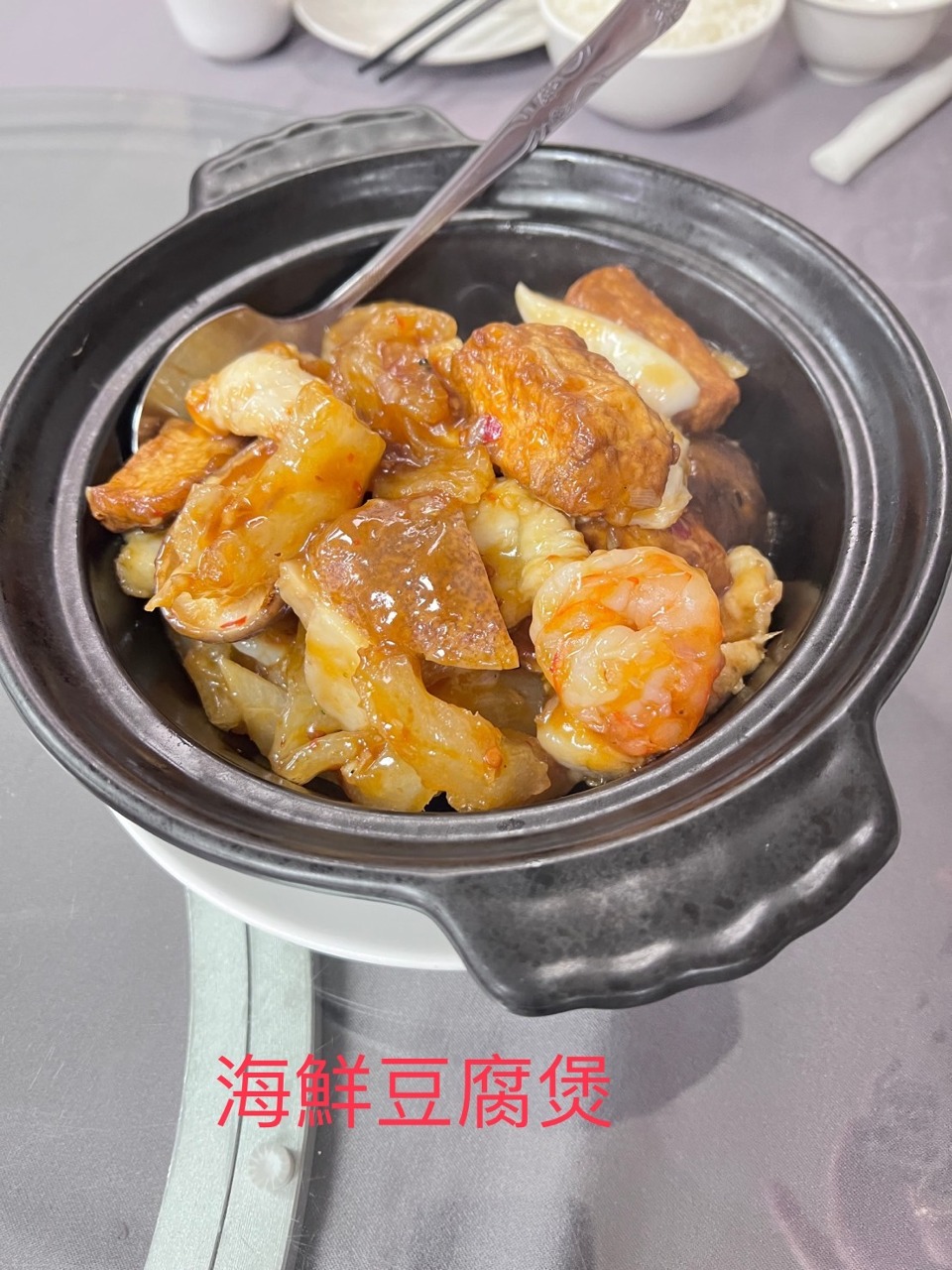 海鮮豆腐煲-海鮮拼盤帶有濃稠的醬汁,材料有海參、魷魚、香菇、花椰菜、魚肉、雞蛋豆腐