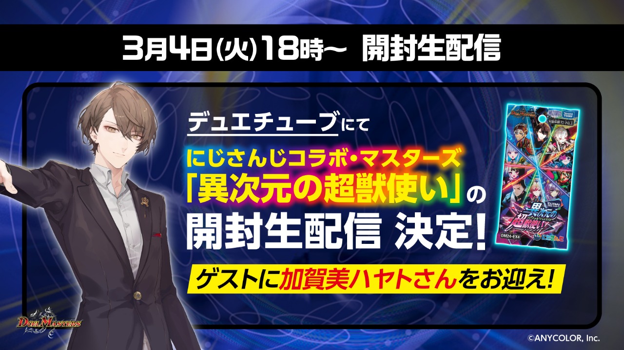 」頻道,將邀請加賀美準人(社長)作為嘉賓進行與彩虹社合作卡包「異次元の超獣使い」的開箱直播