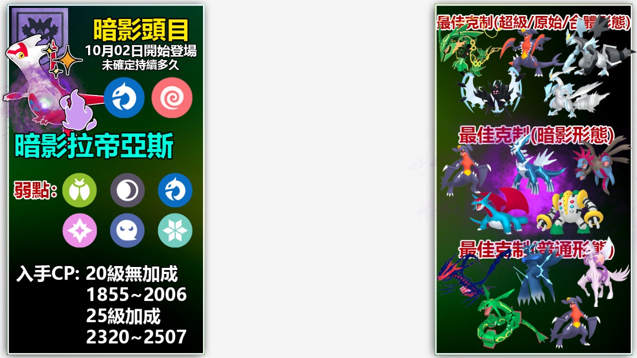 若想更全面去了解所有傳說和超級團戰頭目的攻略需知,請移步查看: https://youtu.be/kF8ALF3Ovys