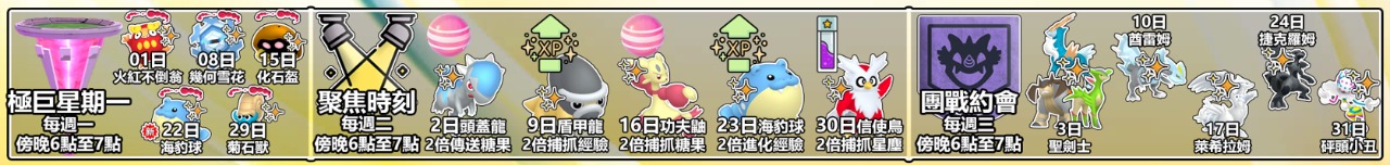 每週一傍晚6點至7點例常舉行極巨星期一,這個月初登場的極巨化形態目測只有極巨化海豹球一隻!
