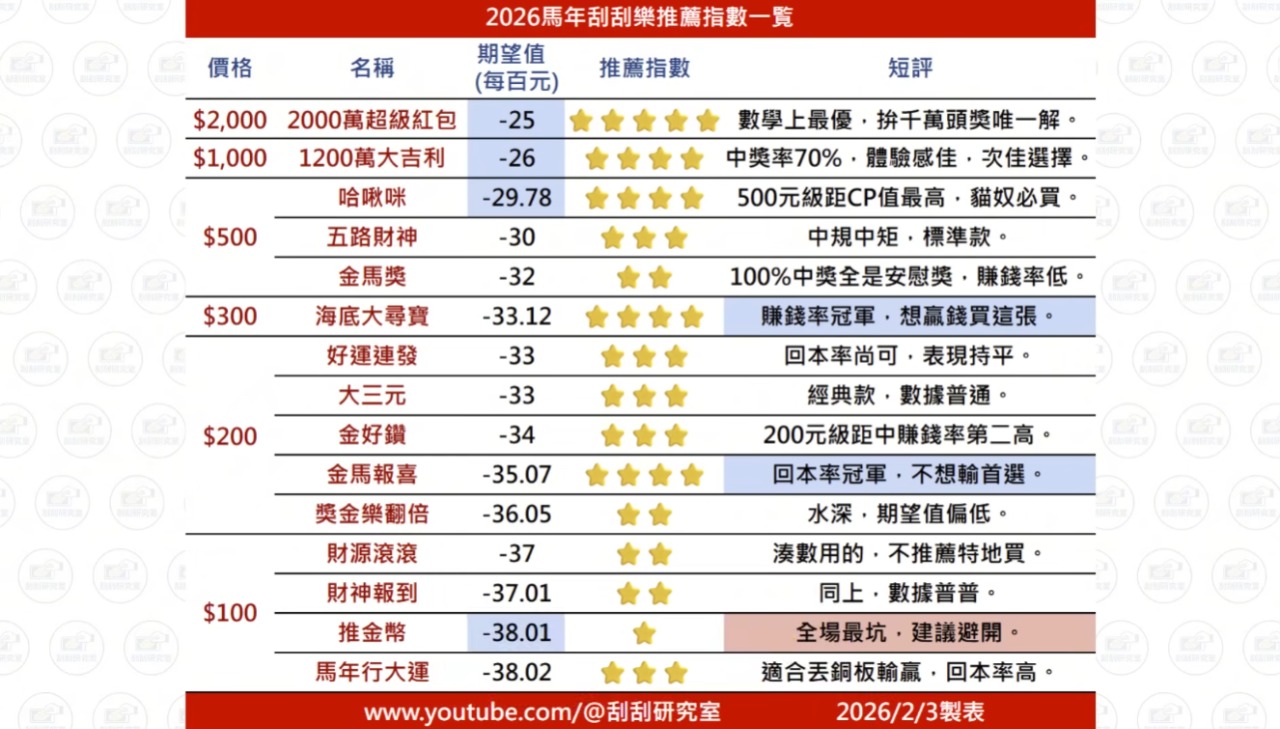 如果目標是追求「虧損最小化」,根據數據顯示,面額越高的刮刮樂,期望值表現通常越好: