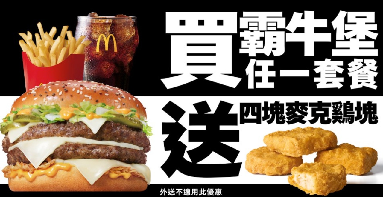 ■凡購買「霸牛堡」任一套餐,即送四塊麥克鷄塊一份,此優惠不適用於歡樂送與第三方外送平台。