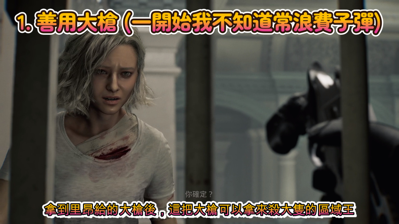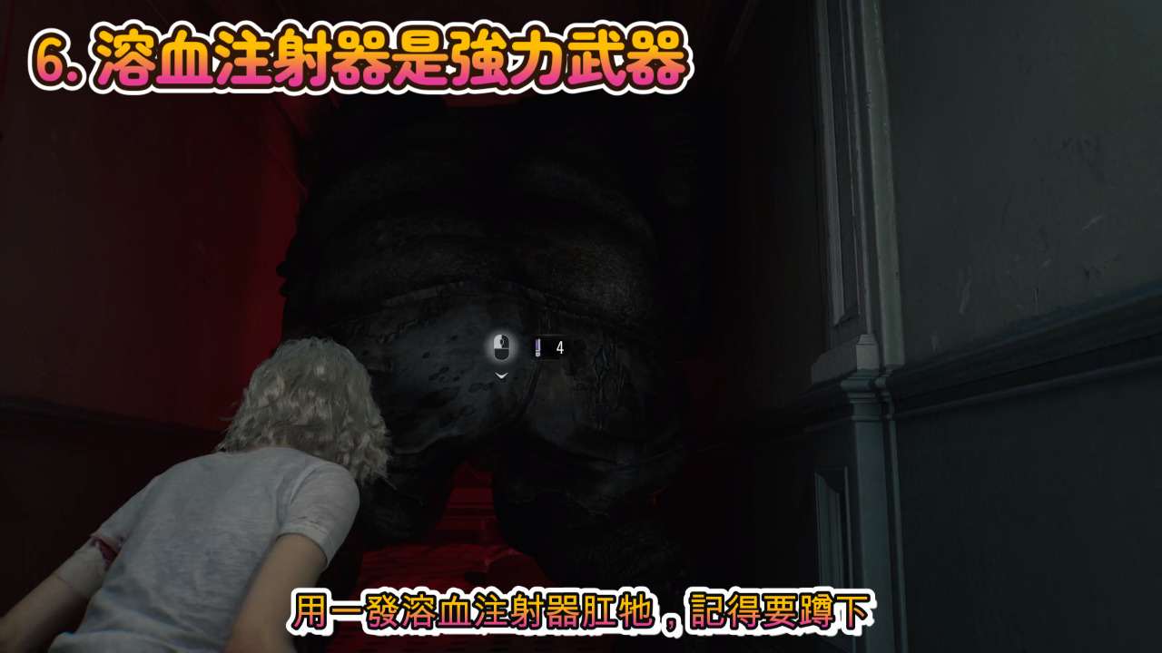 第一張圖東翼區的區域王超大肥喪屍,可以在他追逐放棄往回走時,我們可以蹲下跟上去,用一發溶血注射器肛牠,記得要蹲下,不然你可能會變成用小刀攻擊牠。當然你也可以用里昂給的大槍解決他,但溶血注射器是最快的。簡單模式下,一發注射器就可以讓牠融化。