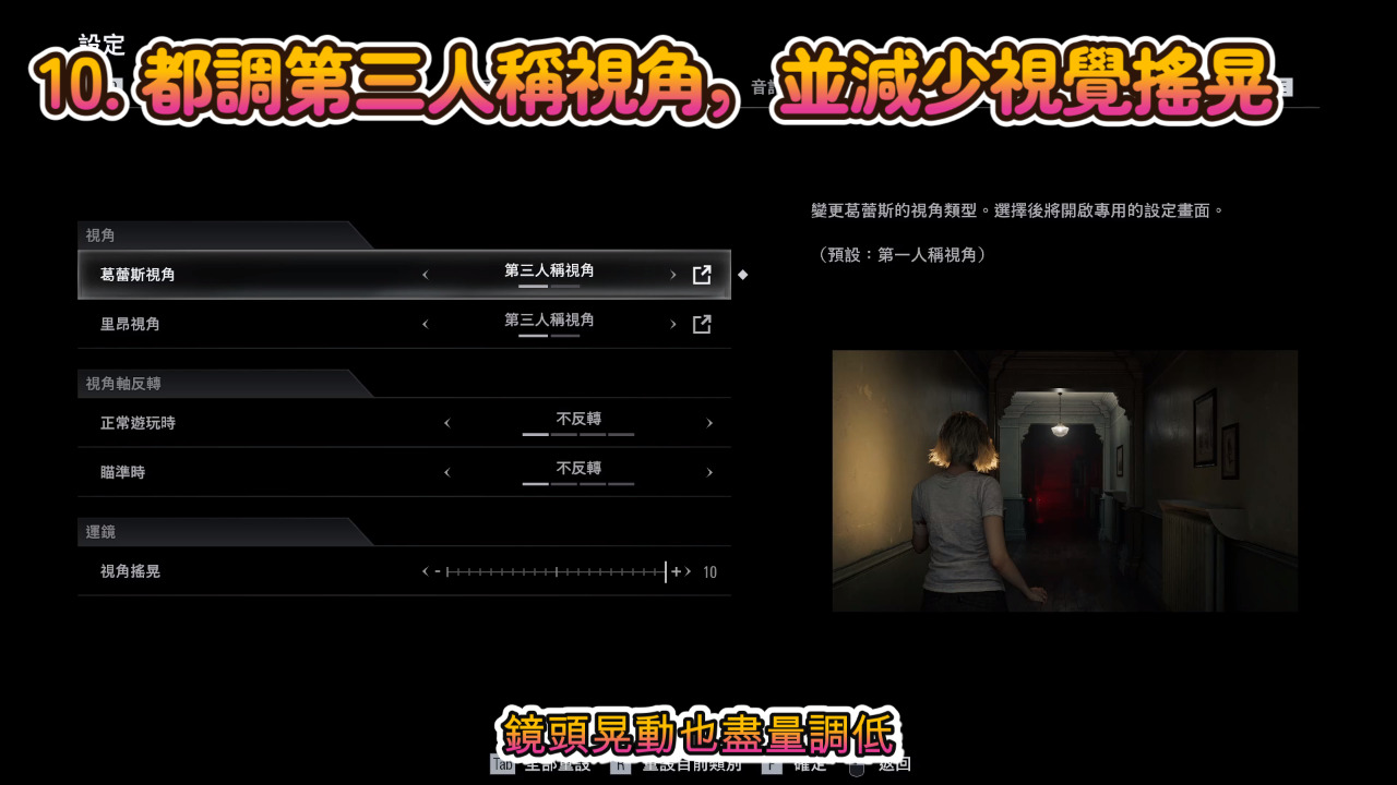 因為遊戲時間很長,請把所有視角都調成第三人稱,鏡頭晃動也盡量調低,依照自己的身體狀況來遊玩,不然晃來晃去造成的3D暈會讓你很難受。