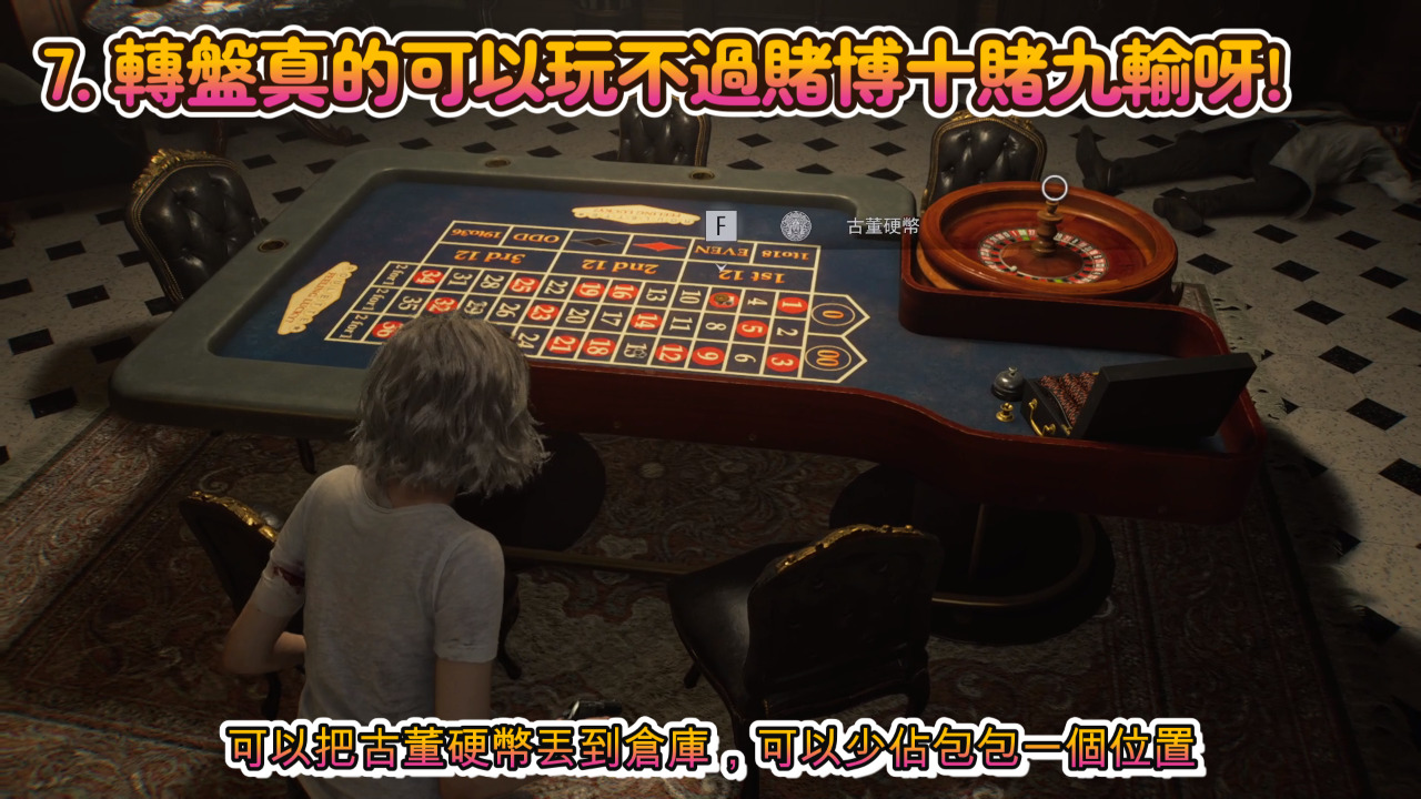 遊戲室的轉盤賭博裝置其實是可以玩的,它通常會轉到7, 15, 29,我們用槍擊中其中一個號碼再拉動轉盤,只要猜中它就會給你一枚古董硬幣。另外當你把遊戲室獎勵都換完後,可以把古董硬幣丟到倉庫,可以少佔包包一個位置。