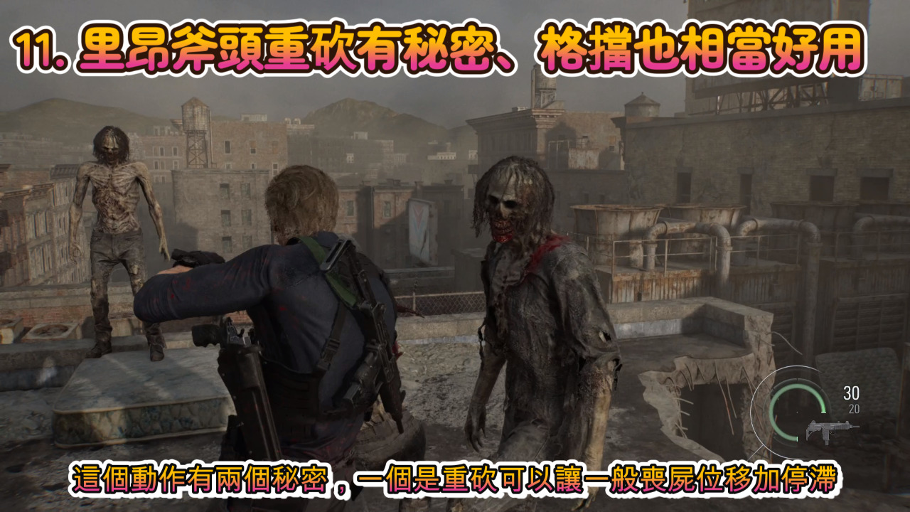 里昂的斧頭可以無限使用,右下角耐用度快沒了就按打磨,鍵盤的話就是E,里昂的斧頭按著空白鍵再砍的話會造成重砍,這個動作有兩個秘密,一個是重砍可以讓一般喪屍位移加停滯,第二是重砍的旋轉有類霸體的作用,有些時候敵方撲過來時一個旋轉反而沒有受到傷害。
