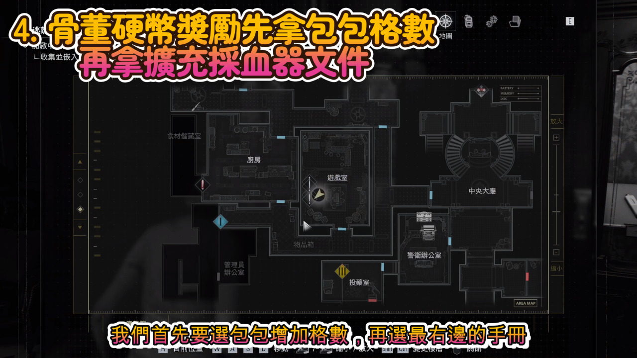 西翼大樓遊戲室用古董硬幣換的四個獎勵,我們首先要選包包增加格數,再選最右邊的手冊,能增大採血器的容量到150,東翼大樓拿到的採血器,採的喪屍血可以拿來製造所有的東西,包括大槍的稀有子彈,所以特別重要。也不用擔心古董硬幣不夠,很快就有足夠的硬幣可以換到增加血量的類固醇,還有提升用槍能力的穩定劑,另外拿到空的注射器,玩家社群有分享製作成穩定劑帶來的效益比較大。