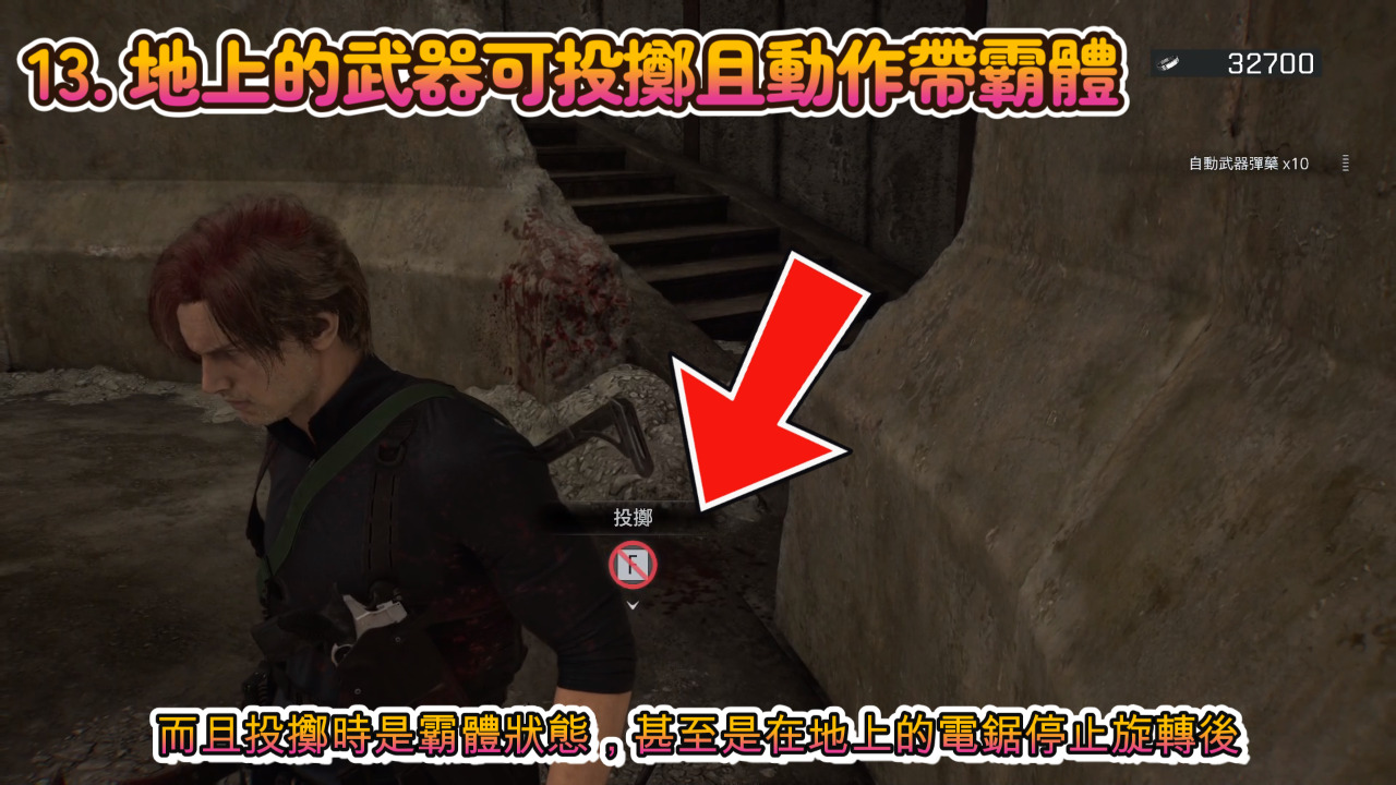 敵人手上的武器掉在地上後,都會變成我們可以投擲的致命武器,而且投擲時是霸體狀態,甚至是在地上的電鋸停止旋轉後,我們也可以把電鋸撿起來大殺特殺一番。玩里昂時可以多用各種制敵手段,依照我的經驗子彈是源源不絕一直進來的。我們不但可以自己製造,也可以用獎勵系統換基礎子彈。