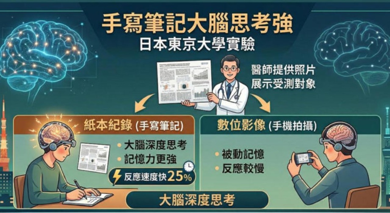 從腦科學的角度來看,手寫與打字對大腦的刺激確實存在差異。大腦開發老師林詩筑解釋,敲鍵盤時可能只用到兩根手指頭,但寫字時需要整隻手的抓握動作。她說明,不同的書寫工具如鋼珠筆、鉛筆,其摩擦力各有不同,這些差異會觸發大腦的頂葉區域,該區域負責肢體的操控力。林詩筑表示,書寫時需要挪動位置或翻頁,這些動作都需要大腦進行調整,因此能觸發較多的腦區運作。