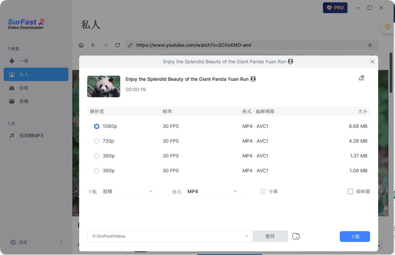 SurFast Video Downloader 跳出下載視窗;選擇需要的畫質,再次點擊下載按鈕。