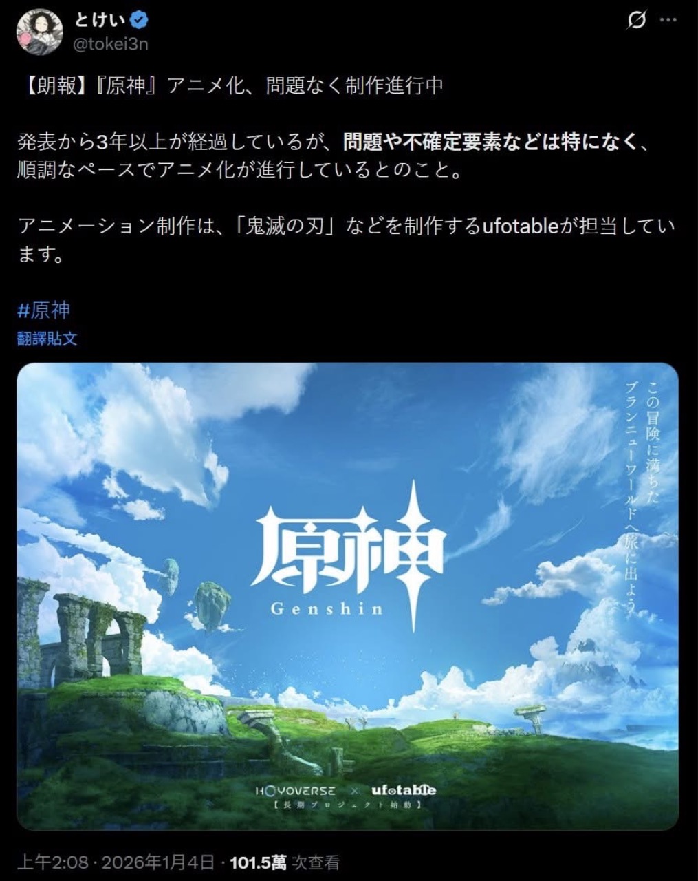 「請放心,沒有意外,也沒有任何不穩定的因素,《原神》動畫化企劃正在穩步推進中。」