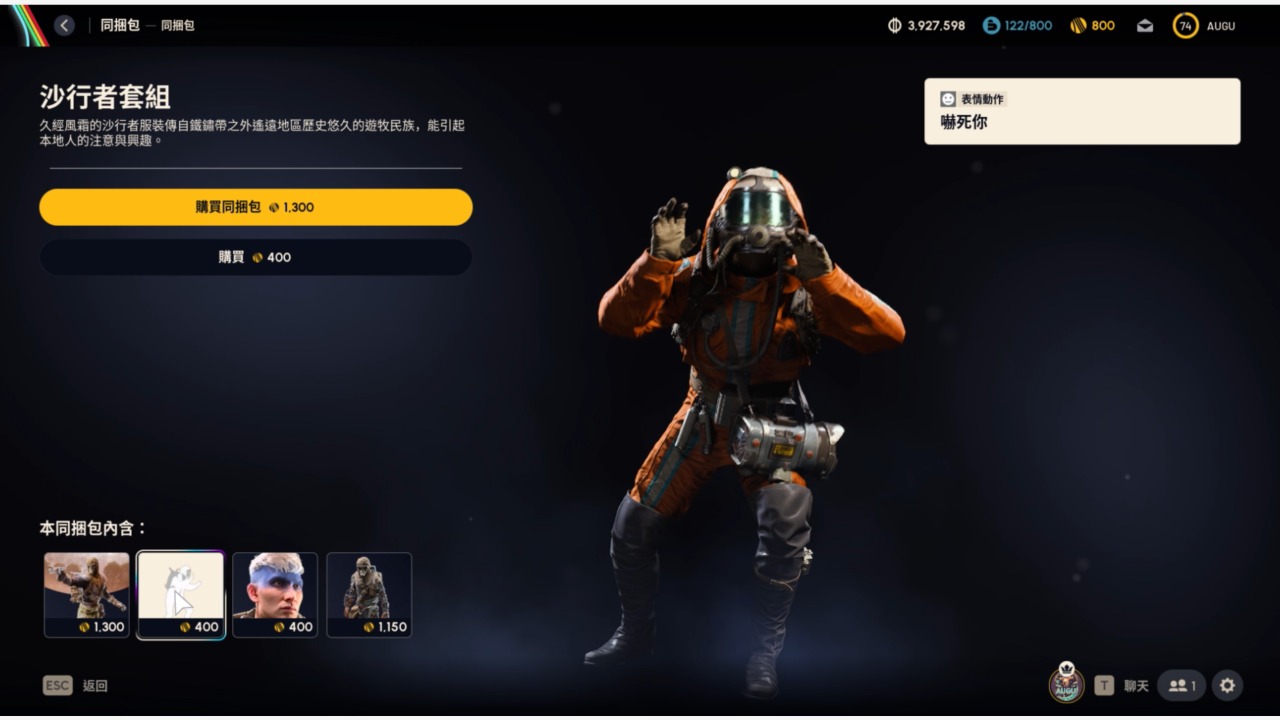 商店外觀上推出了一款沙行者,有三套顏色組合可以選擇,保護色的意義大於外觀好看與否,暗色系實在是太適合躲藏了,但它包含的動作”嚇死你”可能會讓人想開槍打你ww。