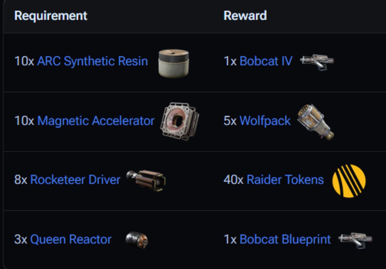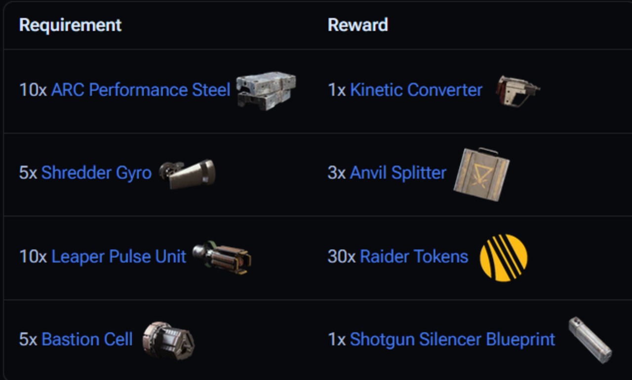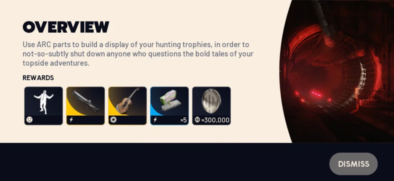 第二個更動是,官方推出了一個新機制可以讓玩家上繳Arc身上的掉落物來獲取獎勵,總共有五個階段,獎勵有道具、藍圖、代幣等等,全部完成還會送嚎叫的動作、30萬金幣跟一把吉他。