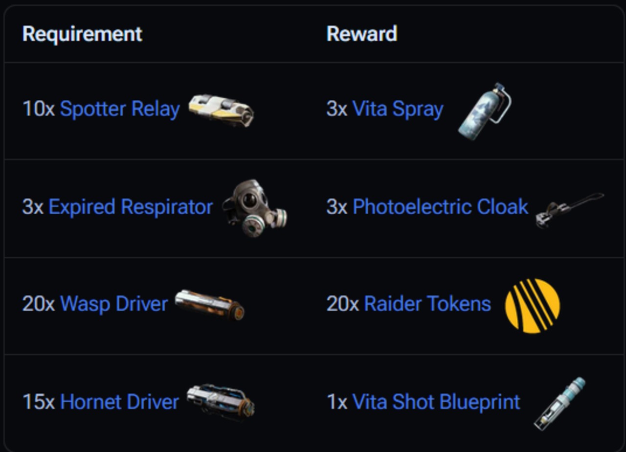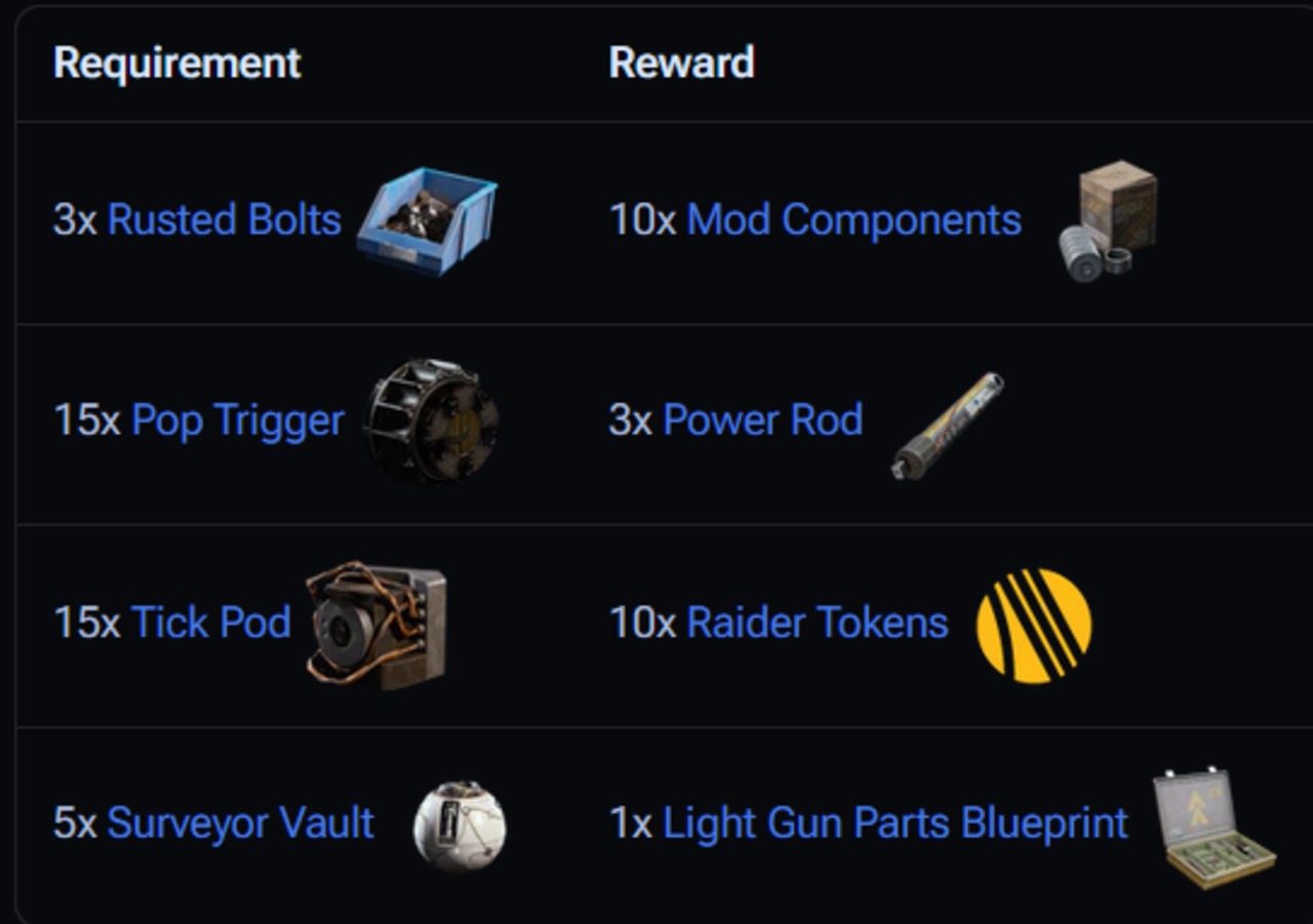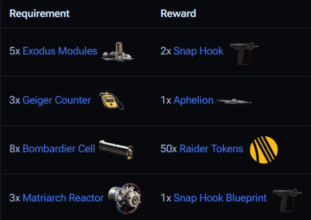 第二個更動是,官方推出了一個新機制可以讓玩家上繳Arc身上的掉落物來獲取獎勵,總共有五個階段,獎勵有道具、藍圖、代幣等等,全部完成還會送嚎叫的動作、30萬金幣跟一把吉他。