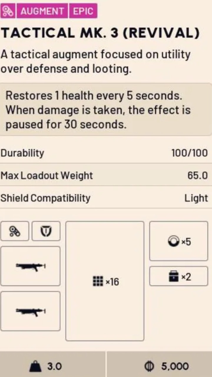 第四個比較重要的就是添加了兩種強化裝置,這部分官方很神祕,但還是被玩家社群立馬找出來了,一個是戰術第三型 Revival ,每五秒恢復一點生命,遭受攻擊後要30秒cd,只能裝輕型護盾,十六格包包,五格道具欄,兩格安全口袋,我個人感覺不是特別好用,我多帶一組繃帶不就好了。(補充: 自帶4分鐘CD的復活針)