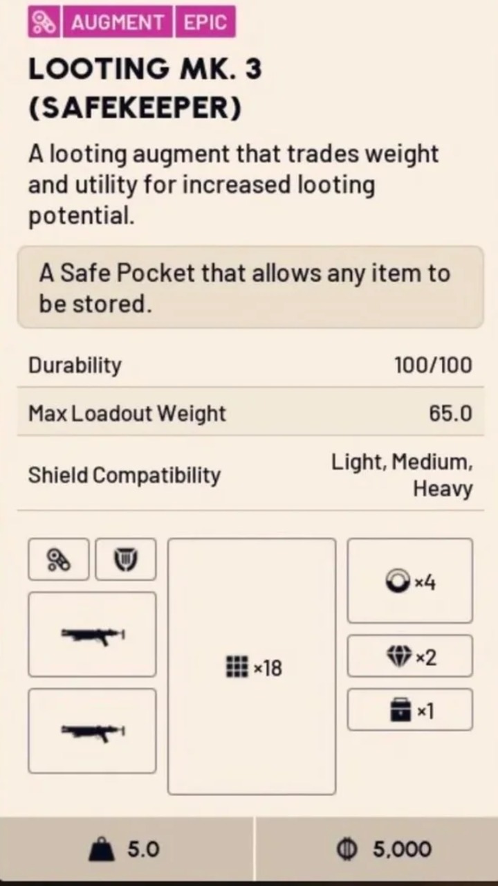 另一個強化裝置是搜刮第三型 SafeKeeper,這個就比較實用了,可以裝到重型護盾,十八格包包,四格道具欄,兩格飾品欄,一格安全口袋,很明顯這個可以用在各種戰鬥場景,兼顧重型護盾跟安全口袋。(補充: 安全口袋甚至可以放槍)