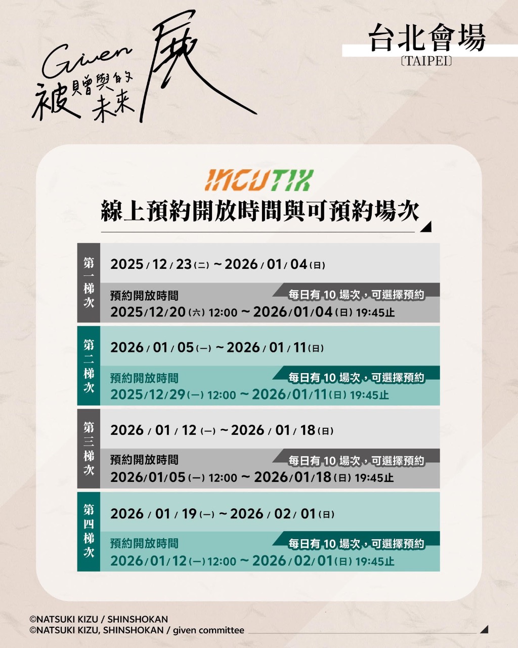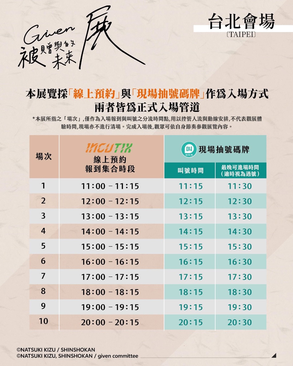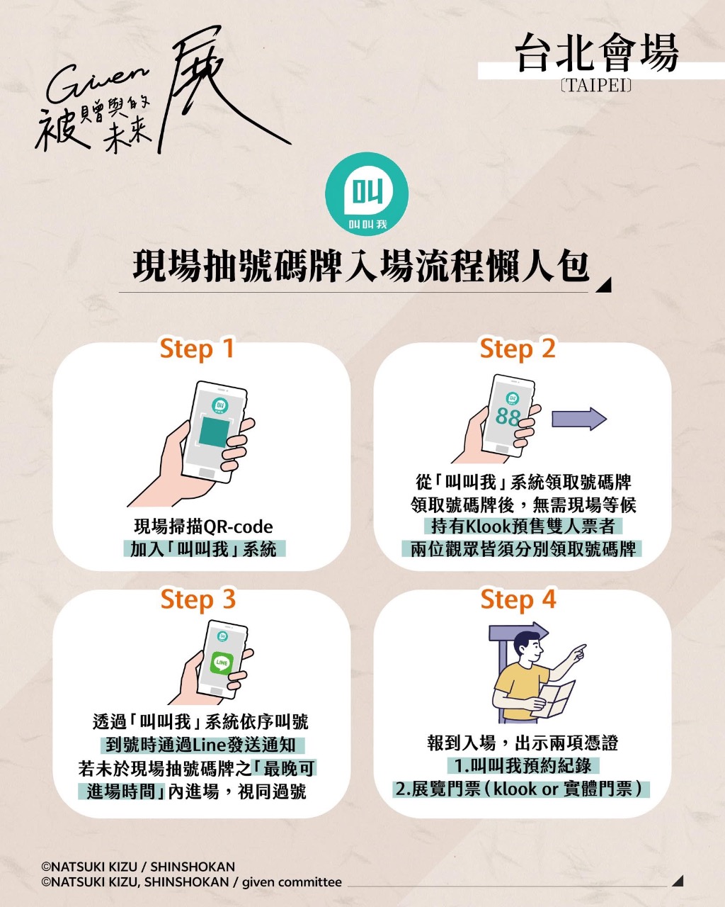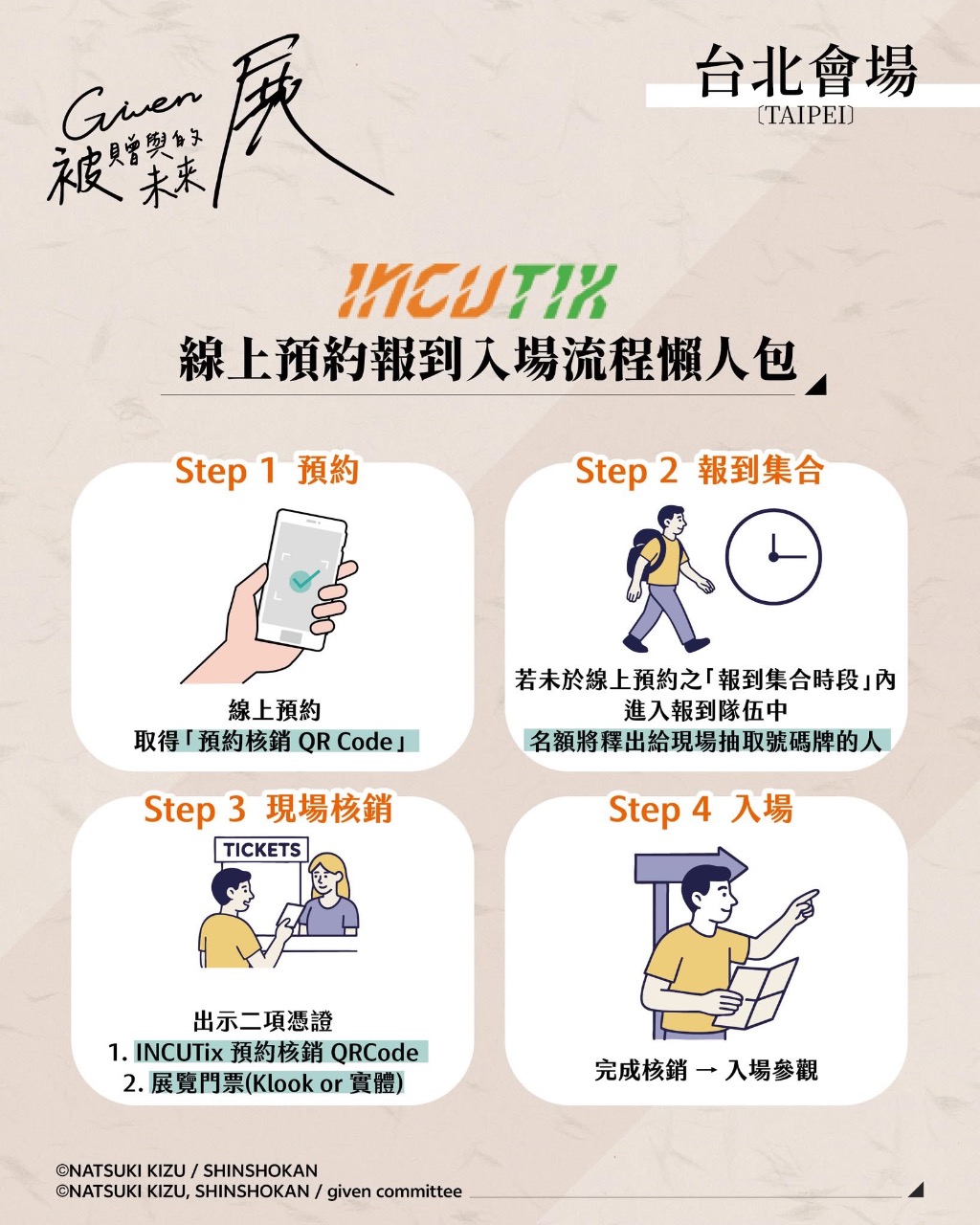 為提供粉絲更順暢、舒適的觀展動線,《GIVEN 被贈與的未來展》台北站在完成與相關執行單位的細部確認後,正式公告全展期間將採用 「INCUTix 線上預約」與「現場抽號碼牌入場」 兩種正式入場方式,每日皆設有固定名額,觀眾可依自身行程彈性選擇。