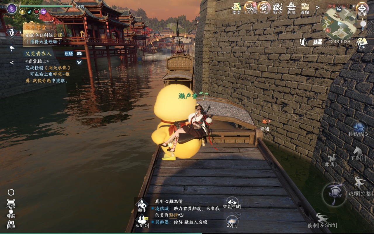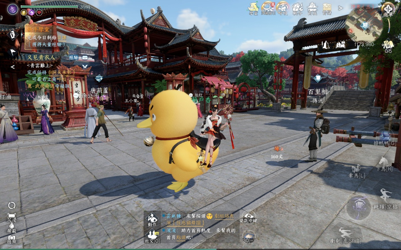 這個鴨鴨還有一個功能是排鴨鴨的技能,如果在路上看到其他有橡皮鴨鴨坐騎的玩家,可以邀請他一起排排隊走,超可愛的呦