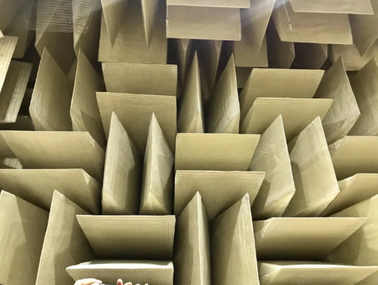 房間四周布滿大三角形的吸音棉,這些吸音棉吸收了所有聲音的回音。