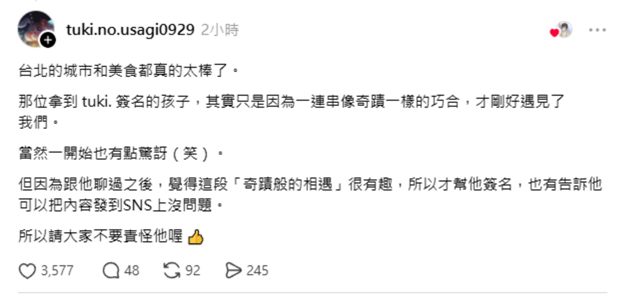 但因為跟他聊過之後,覺得這段「奇蹟般的相遇」很有趣,所以才幫他簽名,也有告訴他可以把內容發到SNS上沒問題。
