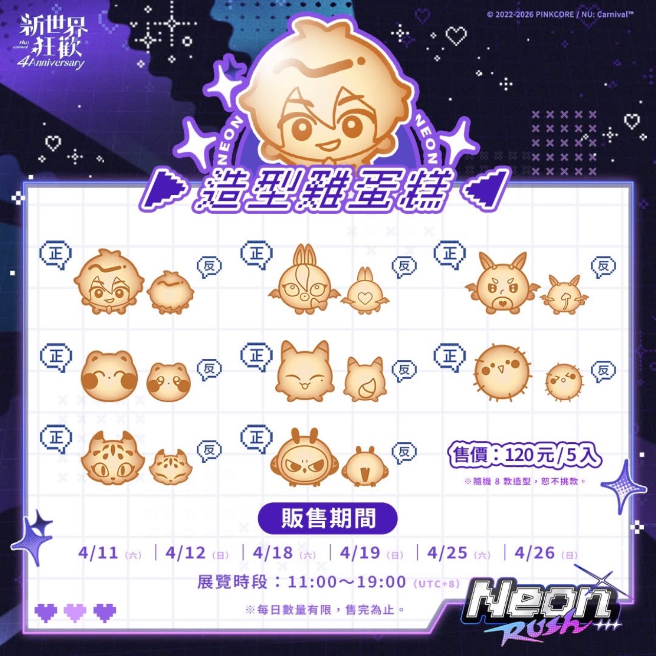《新世界狂歡》四週年紀念快閃店 「Neon Carnival ‑ Neon Rush」 即將在臺北熱鬧開展!這次活動不只帶來粉絲最愛的週年慶祝氛圍,更推出 限量造型雞蛋糕 ,每週末飄香登場,限時快閃、造型超萌,是粉絲必訪的週年活動之一。