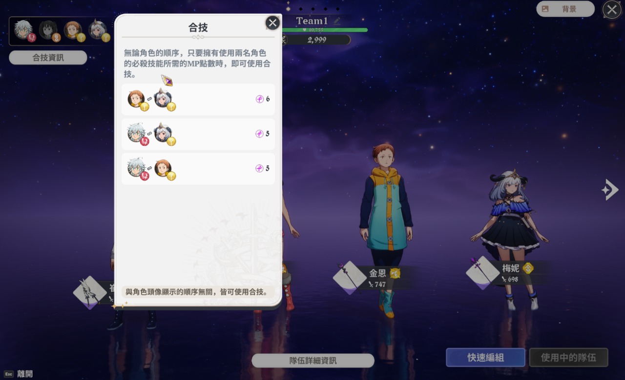 而且遊戲還具備了雙人或三人的連續攻擊系統。只要在隊伍中編組特定角色並連續施放必殺技能,就能觸發伴隨專屬特寫動畫的『合技』,讓玩家的攻勢更具破壞力,因此合技也會是組隊考量之一。