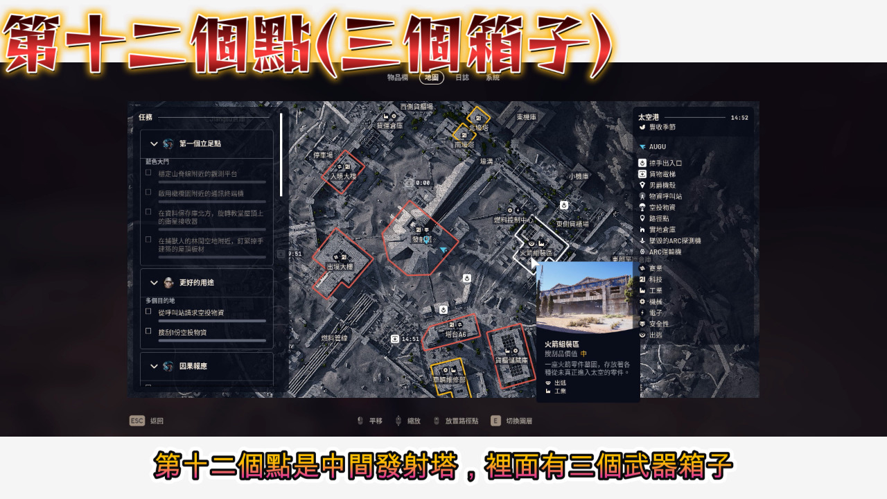 12. 第十二個點是中間發射塔,裡面有三個武器箱子,我們從右邊入口進去,在不遠處角落可以刷出武器箱子,接著我們繞一下路往上爬,找到可以上塔頂的拉繩,上去之後出房間走樓梯來到室外,在平台斷掉處旁邊有機會刷出武器箱子,然後我們跳到對面去,接著欄杆跳下去,進來操控室右前方角落有機會刷出武器箱子,這次取材沒有看到這一個箱子。