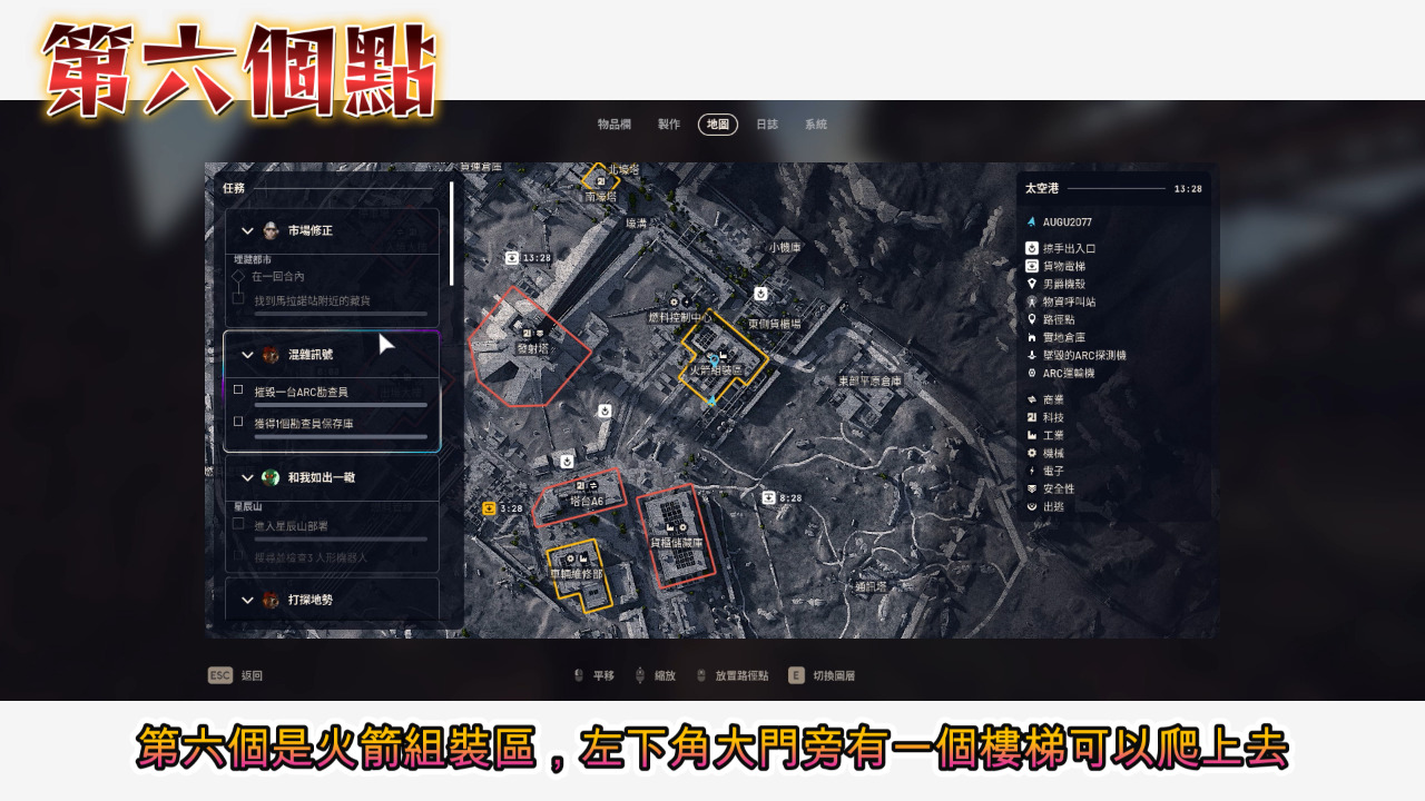 6. 第六個是火箭組裝區,左下角大門旁有一個樓梯可以爬上去,爬上去之後往右走再往東邊看可以看到管線上面有武器箱子,過去之後有路可以下來,詳細看影片。