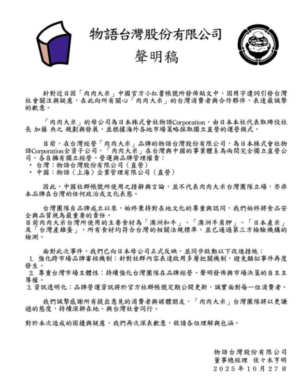 官方IG發表聲明表示