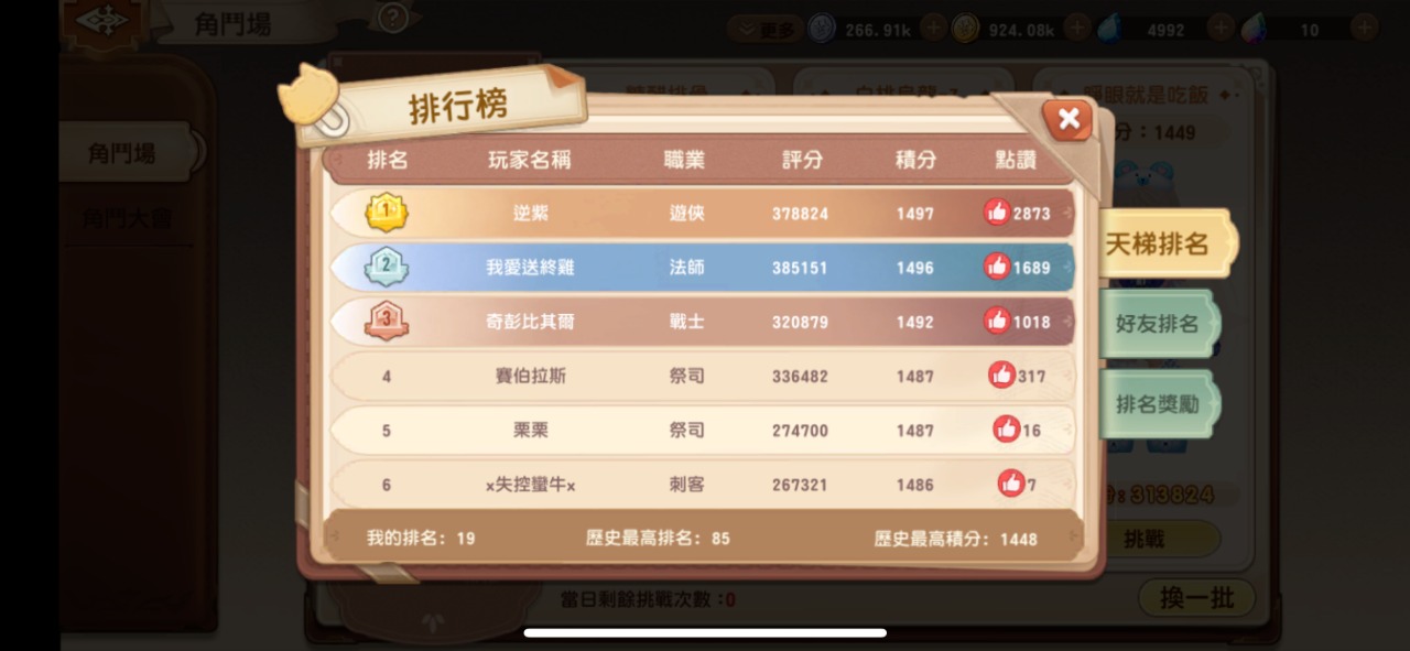 因為角鬥場是有排名額外獎勵的,你太早打只是上去被車下來而已,而且晚上是當天戰力最高的時候挑對手比較簡單