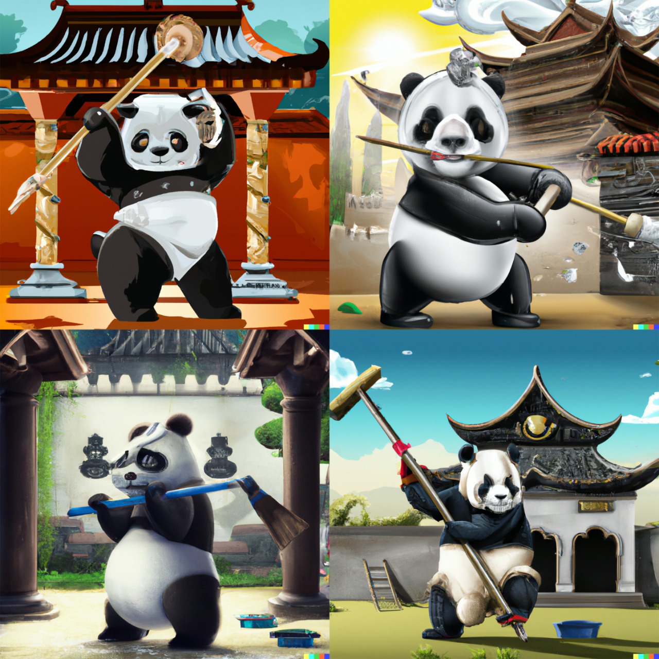 試著用AI繪圖"熊貓在古廟拿刀劍在打掃",大家覺得AI這樣畫的如何??