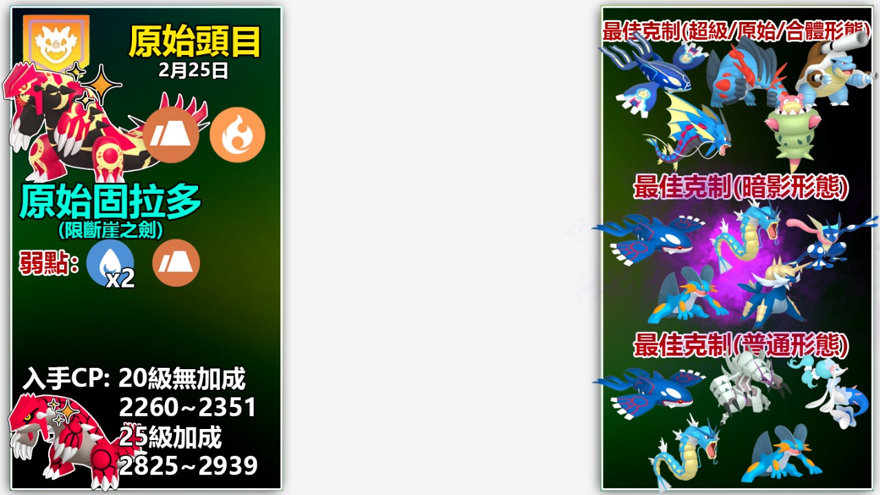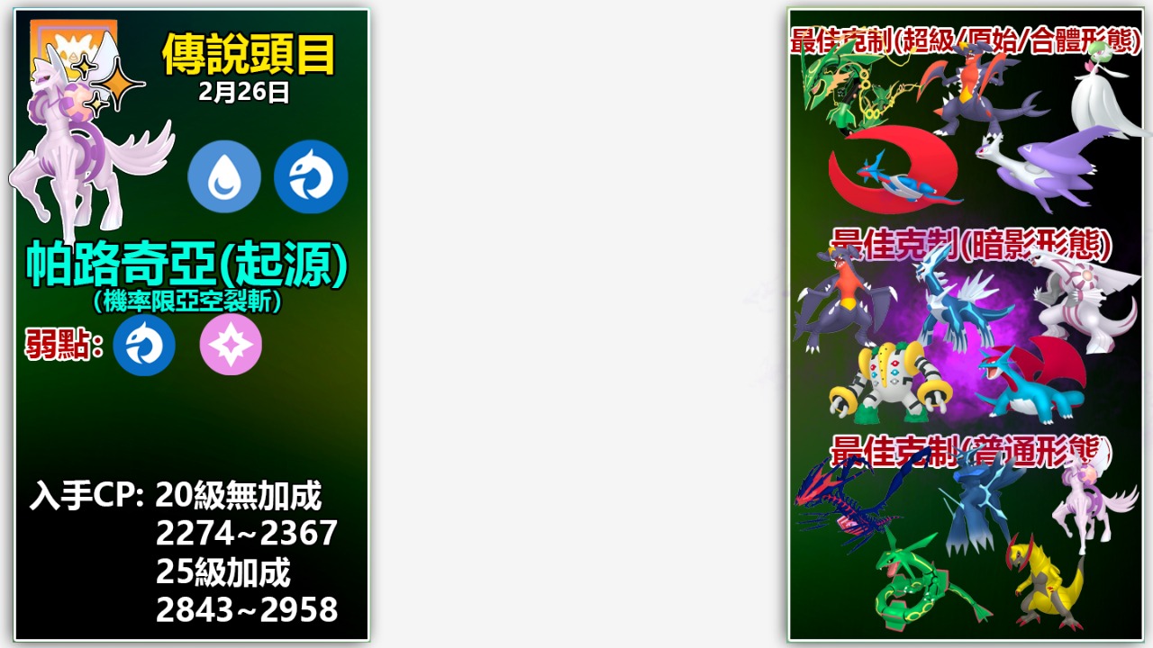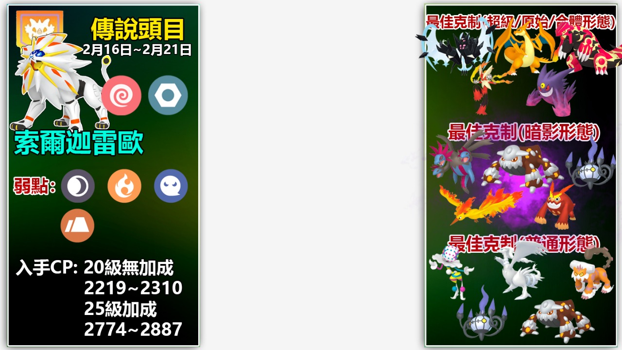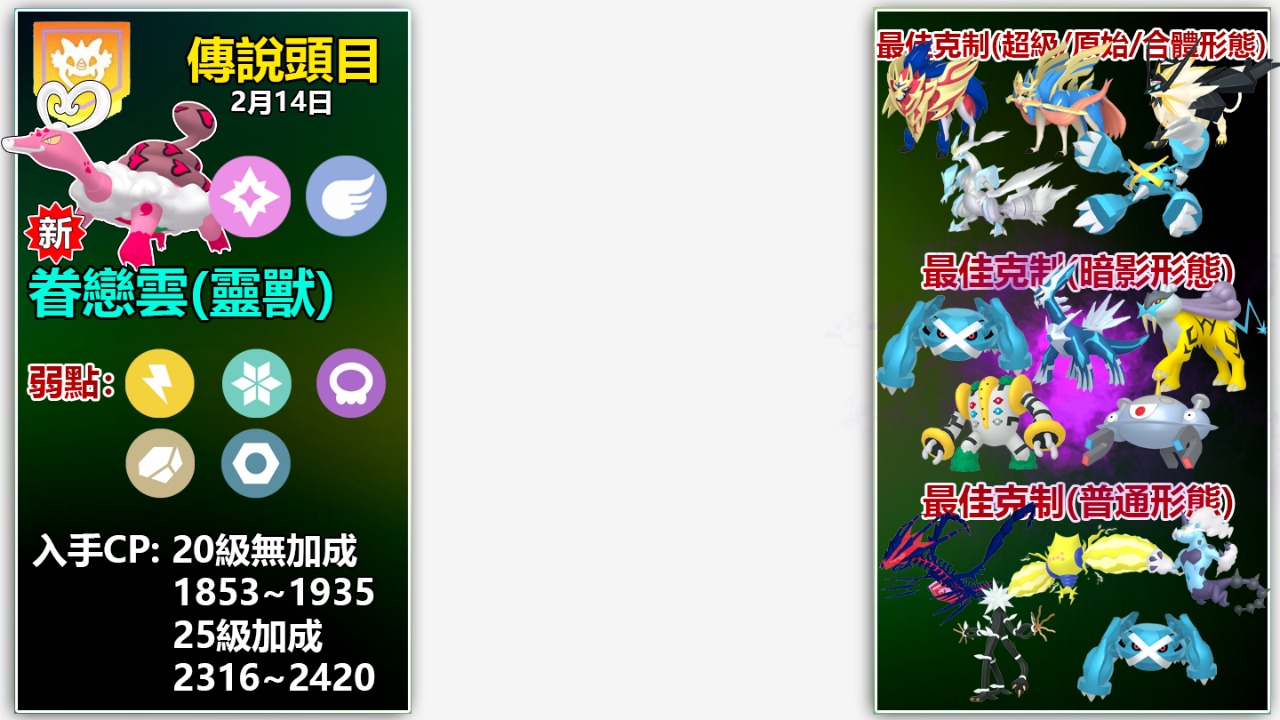 以上頂多是2月20多隻傳說、超級、原始回歸,甚至是合體形態等頭目的冰山一角攻略與詳情!