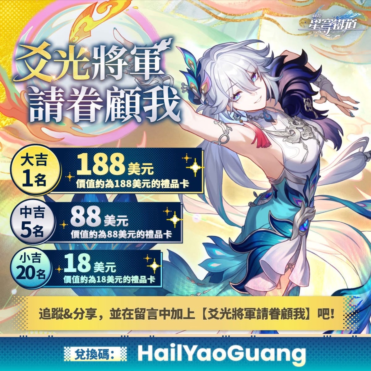 崩壞:星穹鐵道 再掀抽卡熱潮!仙舟掌管好運的神祇角色「爻光將軍」正式迎來 PICKUP 卡池。官方同步推出社群分享抽獎活動,這次更宣布加碼抽最高188美元禮品卡,吸引大量玩家轉發祈福。