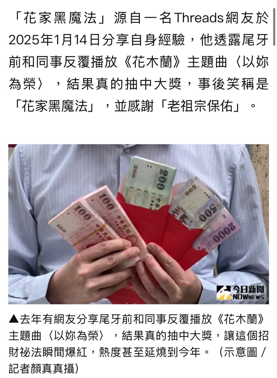這週尾牙我也要刷老祖宗保佑我 尾牙旺季到來,不少上班族實測各種中獎秘訣,《NOWNEWS今日新聞》盤點最熱門的尾牙招財祕法,包含狂聽《花木蘭》〈以妳為榮〉的「花家黑魔法」、更換TWICE娜璉手機桌布、攜帶崔始源財神卡、吉伊卡哇玩偶,甚至掌心紅筆寫「中」,還有人尾牙整桌一起實測,結果每個人都中獎,嗨翻直呼:「中獎率100%。」民俗專家楊登嵙則表示,2026年為丙午火馬年,木、火色系如綠色與紅紫色有助提升運勢,尾牙當天適度運用在穿搭或隨身物品上,為自己多添好手氣。