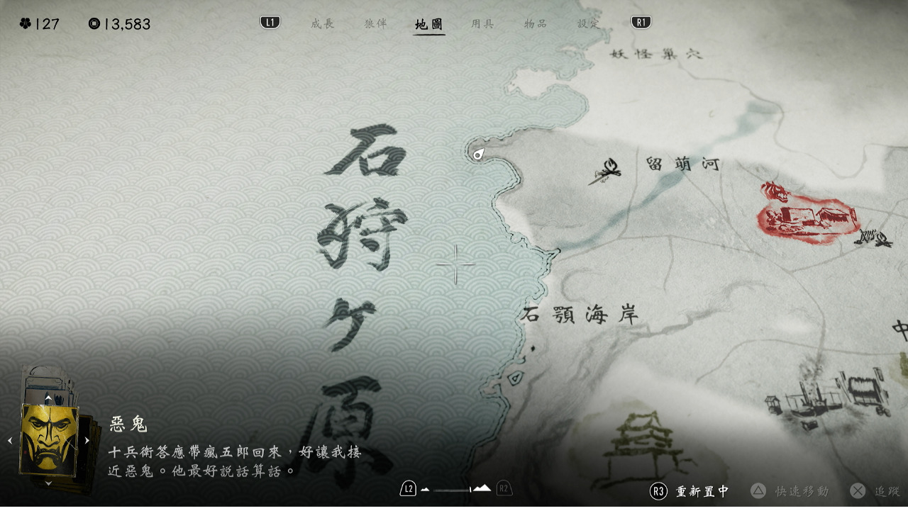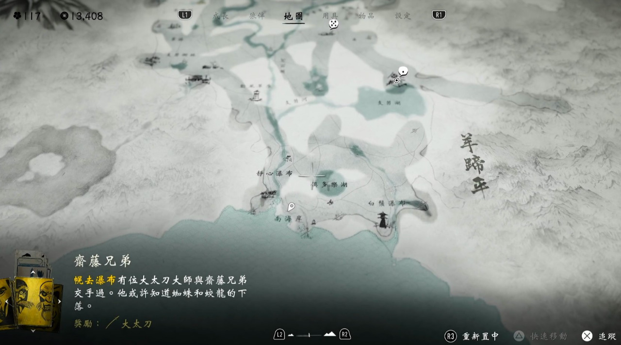 我們在第一章地圖羊蹄平原的南方,可以找到南海岸三個字,南海岸的海字上面可以找到說書人雨月,他都會在樹下搭營窩著,靠近的時候會聽到樂器擊打的敲擊聲,過去跟他說話他會跟你說無雙武藏的傳說。
