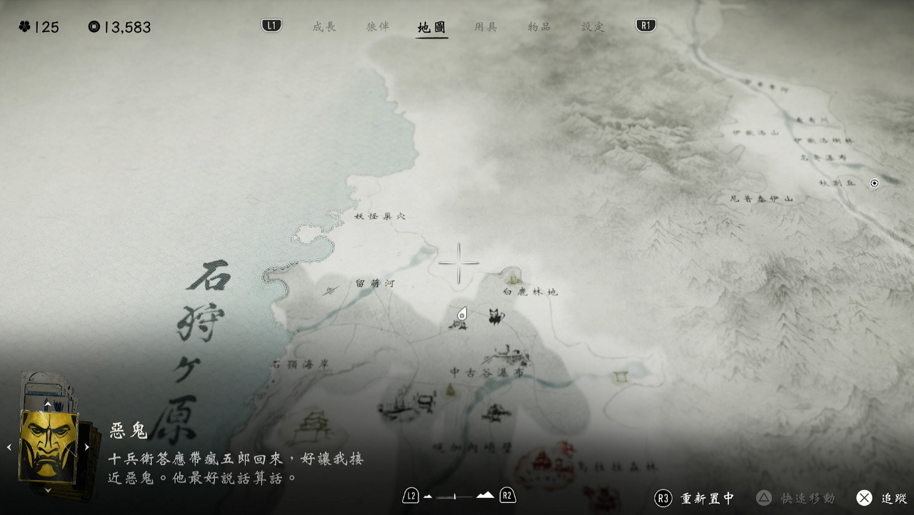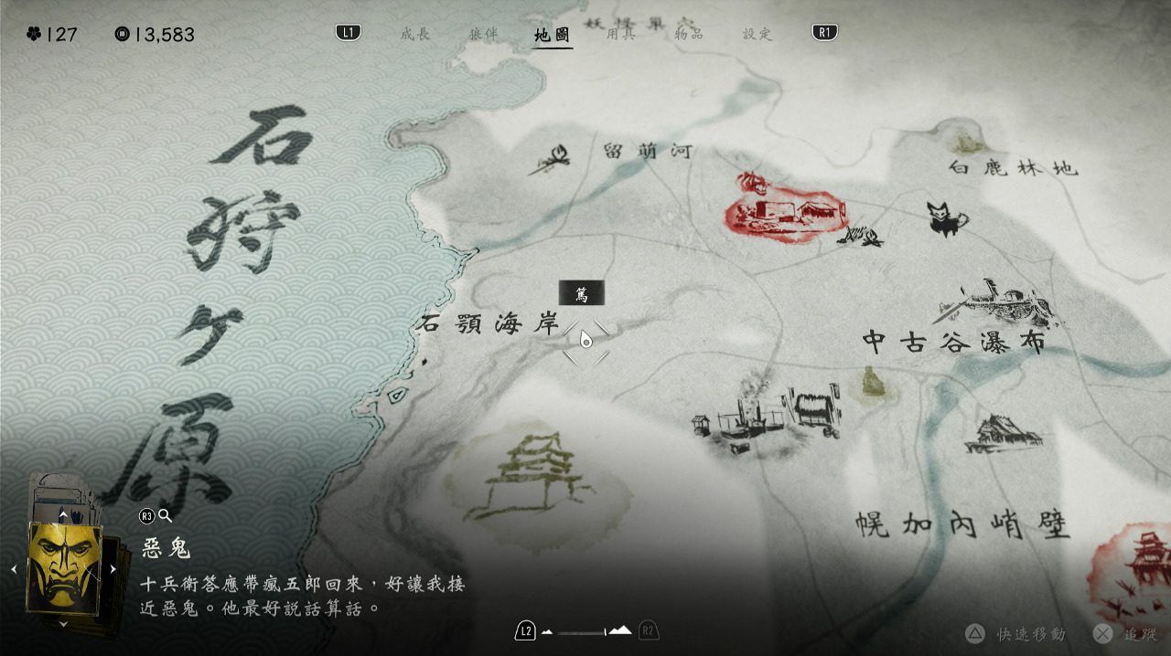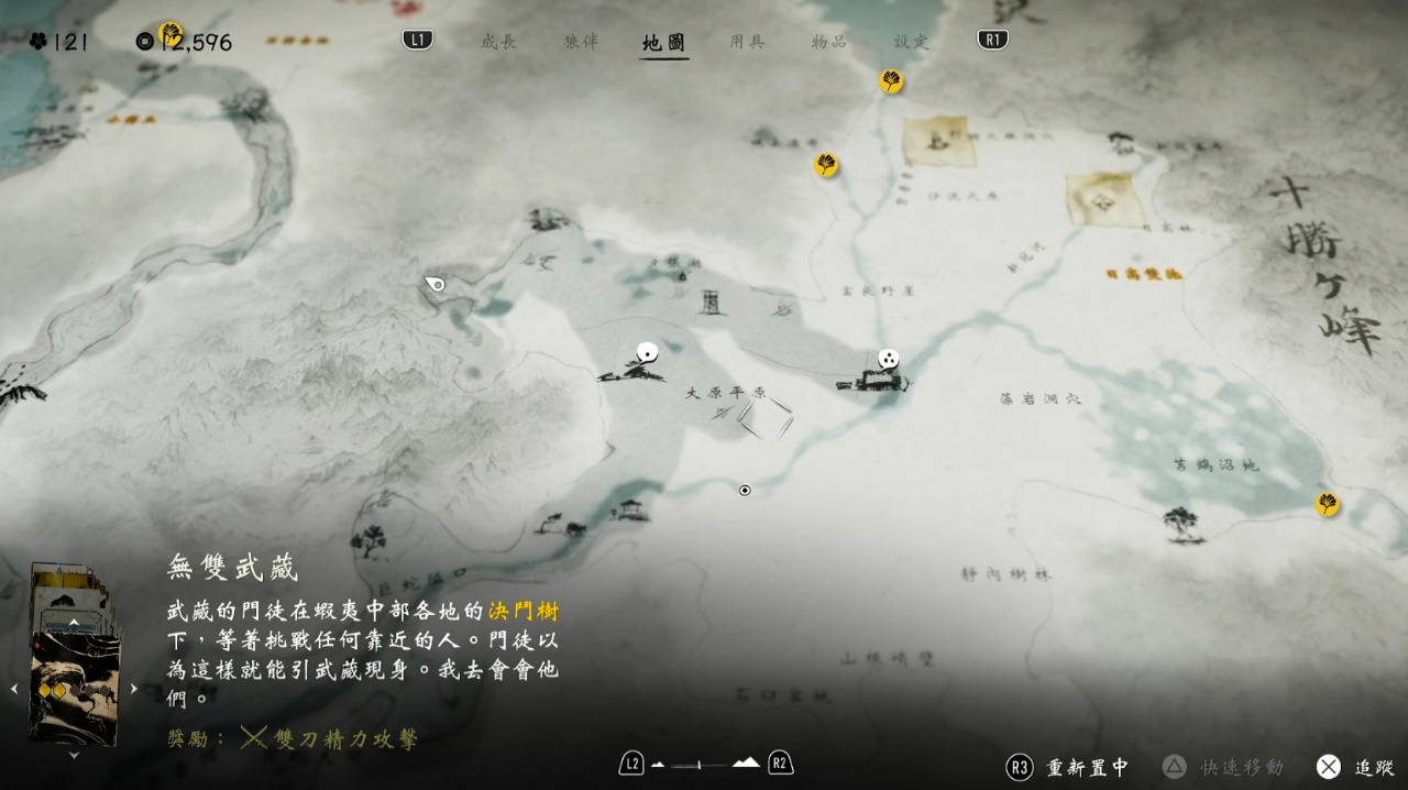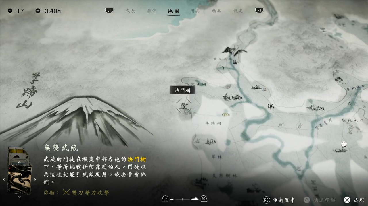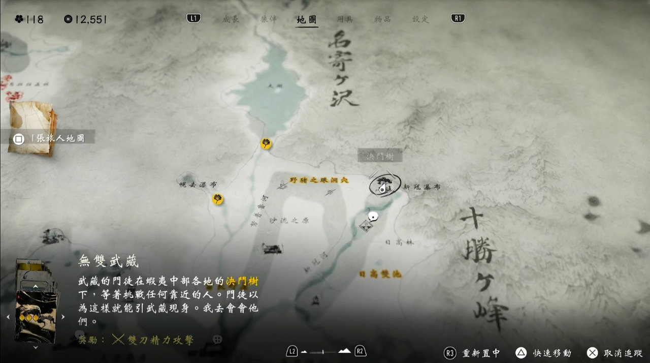 過去之後記得在樹墩上面坐著等他才會觸發劇情,接下來只要跟著他走,他會帶你去海邊測試你,這一場決鬥沒有很難,系統會在最後提示你按圈跟三角形使出武藏雙刀斬,來把武藏打剩最後一點血,接著他會說很欣慰你學會了絕招,很高興自己找到了繼續修練的衝勁,最後約你在羊蹄山上的靜思祭壇旁跟你死鬥。