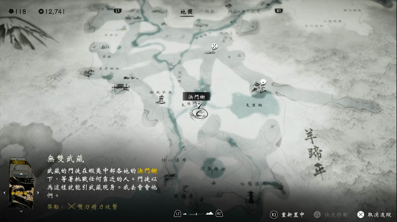 之後地圖上會被標上五個決鬥樹的點,每個決鬥的地方都是鮮豔紅色的大樹,下面都有浪人在等著決鬥,因為不太好打,我會建議身上有雙刀跟長槍之後再去打會比較輕鬆。羊蹄平原有兩個決鬥樹,一個在說書人的上方。