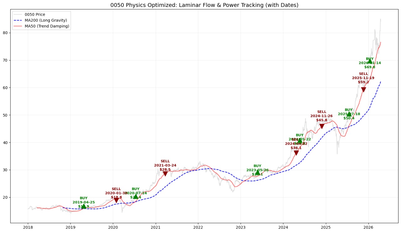 這是一套追逐趨勢 (Trend Following) 的量化策略 。它不追求頻繁交易,而是透過物理指標篩選出 0050 走勢最穩健、能量最強大的時期進行波段操作 。