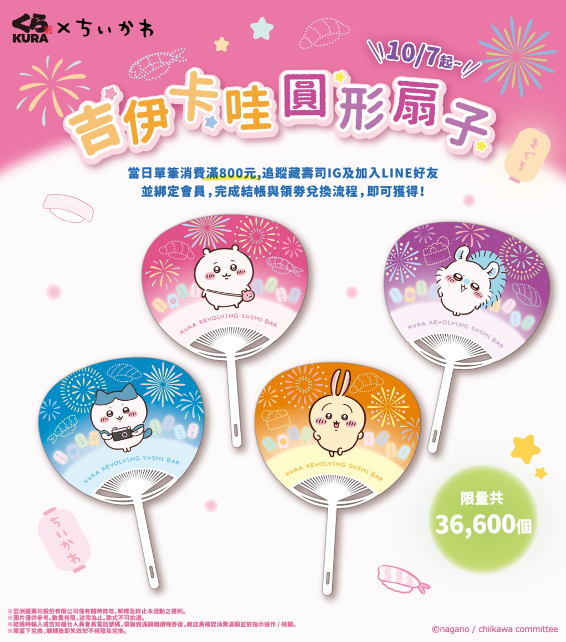 活動辦法 ➊ 當日單筆消費發票金額滿$800元以上 ➋ 需追蹤壽司官方Instagram成為粉絲及加入LINE好友,並綁定會員 ➌ 至櫃台出示畫面+發票,完成結帳與領券兌換流程,即可贈「吉伊卡哇」圓形扇子乙個