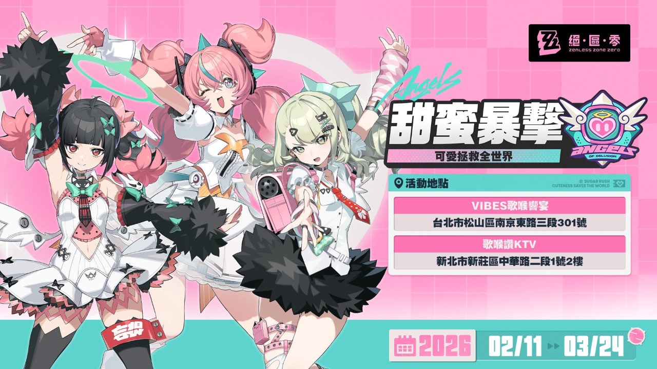 《絕區零》官方聯手 VIBES歌喉響宴KTV 與 歌喉讚KTV 推出期間限定「甜蜜暴擊」應援企劃,不只可以拿虛寶卡、角色閃卡,還能入手多款超萌限定周邊,同時搶先歡唱全新曲目〈妄想天使〉!