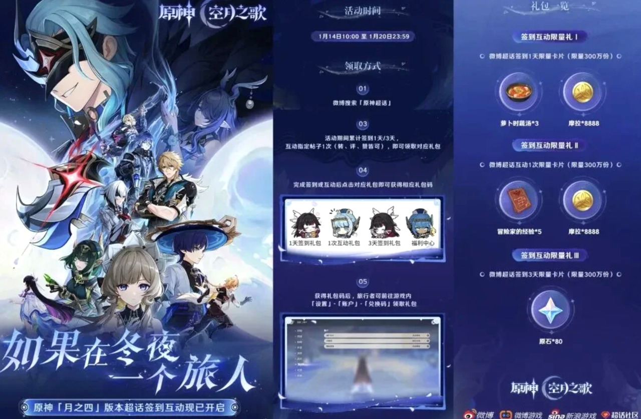 此外,游戏外的活动同样精彩不断:《原神》「月之四」版本微博专属网页活动已经上线,玩家参与话题互动就有机会抽取现金红包、周边礼品等福利;超话社区也同步开启了「月之四」版本第一期签到互动,连续签到3天就能获得80原石的限时兑换码。