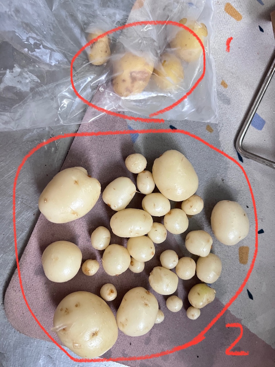 話說我有二個已經發芽的馬鈴薯,大小約拳頭大。 先丟一個回土重生,結果只收獲了四顆迷你小馬鈴薯,最大的約一節大姆指。 於是第二顆,我又是鬆土又是加肥料的,想看看會差多少,結果最近雨下了幾次,馬鈴薯的莖葉已明顯枯萎,我只好鏟鏟看,沒想到收獲大大小小約20顆迷你小馬鈴薯,最大的約有一個大姆指長,比上次好好了。 經過二次種植成果,我覺得我可能種歪了?我從二顆拳頭大小的馬鈴薯變成分裂版本的馬鈴薯🥔🤦