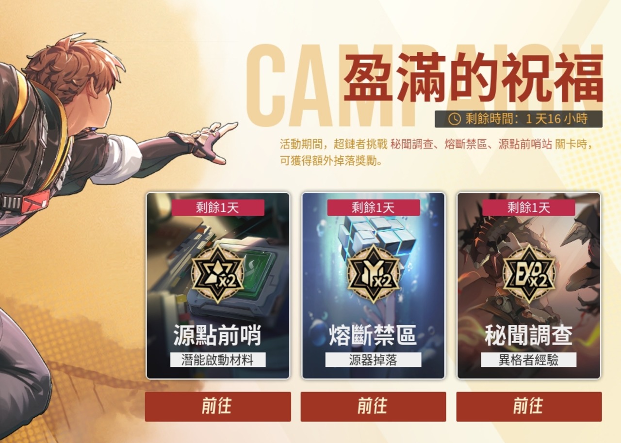 不管是源器掉落、異格者經驗、潛能啟動材料,全部翻倍,絕對划算。