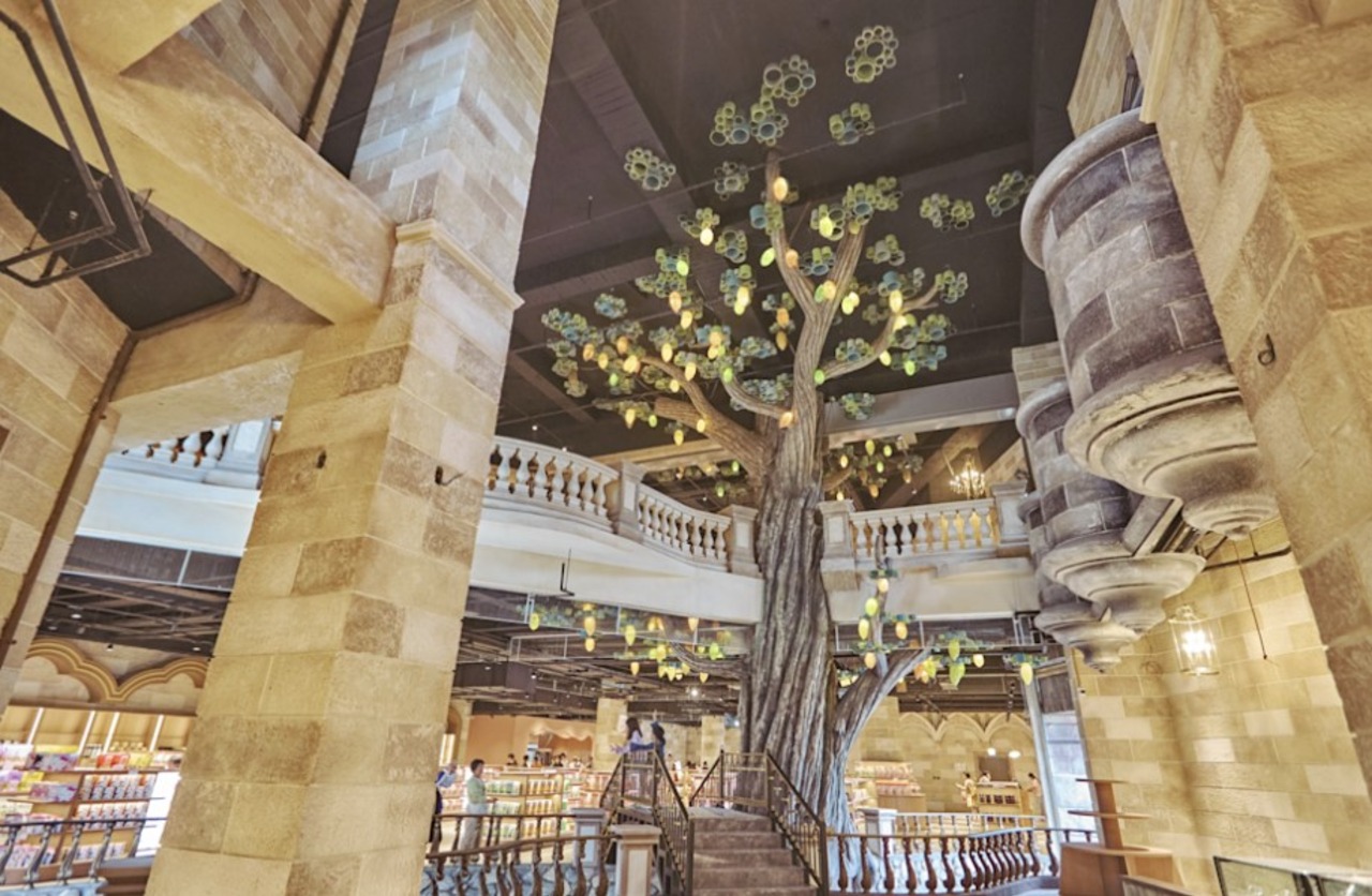 「築夢城堡」則是園區的核心地標,這座五層的藝術建築不僅是視覺上的震撼,更是夢想的具體實現。一樓販售區提供歐樂沃限定商品「梅香金磚」及多種巧克力商品;二樓設有美式自助餐廳;三至五樓則規劃為宴會廳、兒童互動遊戲區及主題餐廳等多元場域。城堡中央的10米高「黃金可可樹」成為人氣拍照打卡景點,入口處的互動媒體裝置「可可符碼」更增添了沉浸感。