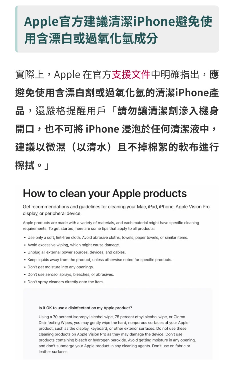 從多方研究初步分析指出,這次會造成 iPhone 17 Pro變色情形與使用含「過氧化氫」(除俗)的清潔劑有關,含有雙氧水成分,都會造成表面顏色被破壞,實際這些就是生活中常見的清潔劑如下: