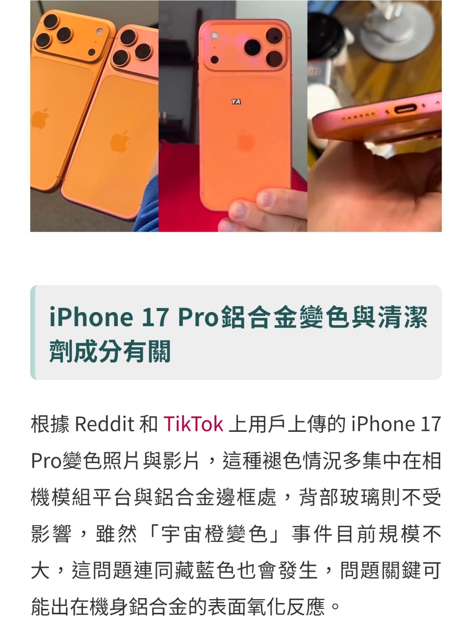 先說結論,使用iphone17 pro 的用戶請盡量避免使用酒精及洗潔劑擦拭手機,已避免變色