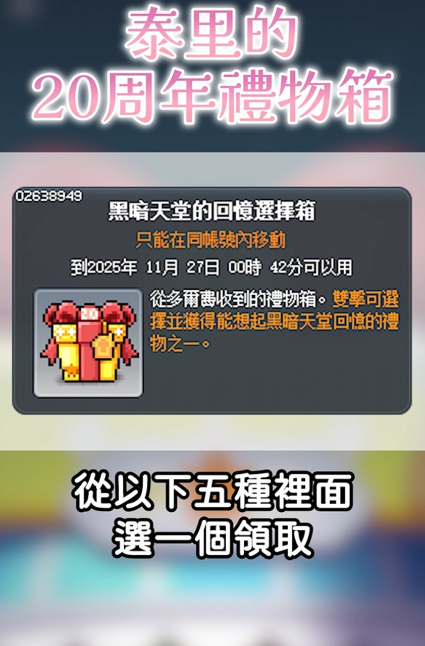 泰里的禮物必需在11/20 23:59 前領取完成 內容物依舊有 靈魂艾爾達碎片交換券 200片(可傳倉) 準備好的精靈項鍊交換券(30天) 1個 (可傳倉) 以及這個月多的 普通彩色稜鏡交換券 20個(可傳倉) 找泰里隔壁的三個傻瓜 可以領取黑暗天堂的回憶選擇箱 從以下五種裡面選一個領取 shorts:11月泰里20週年禮物