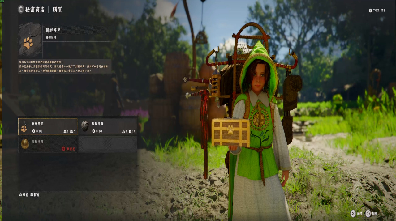 寵物的東西我猜一定是在波羅琳村,果然我們可以在城鎮中央找到走來走去的神秘商人蕾西,要記得他會在村裡路上走來走去,繞一下一定能找到,可以在他那邊買到羈絆符咒。